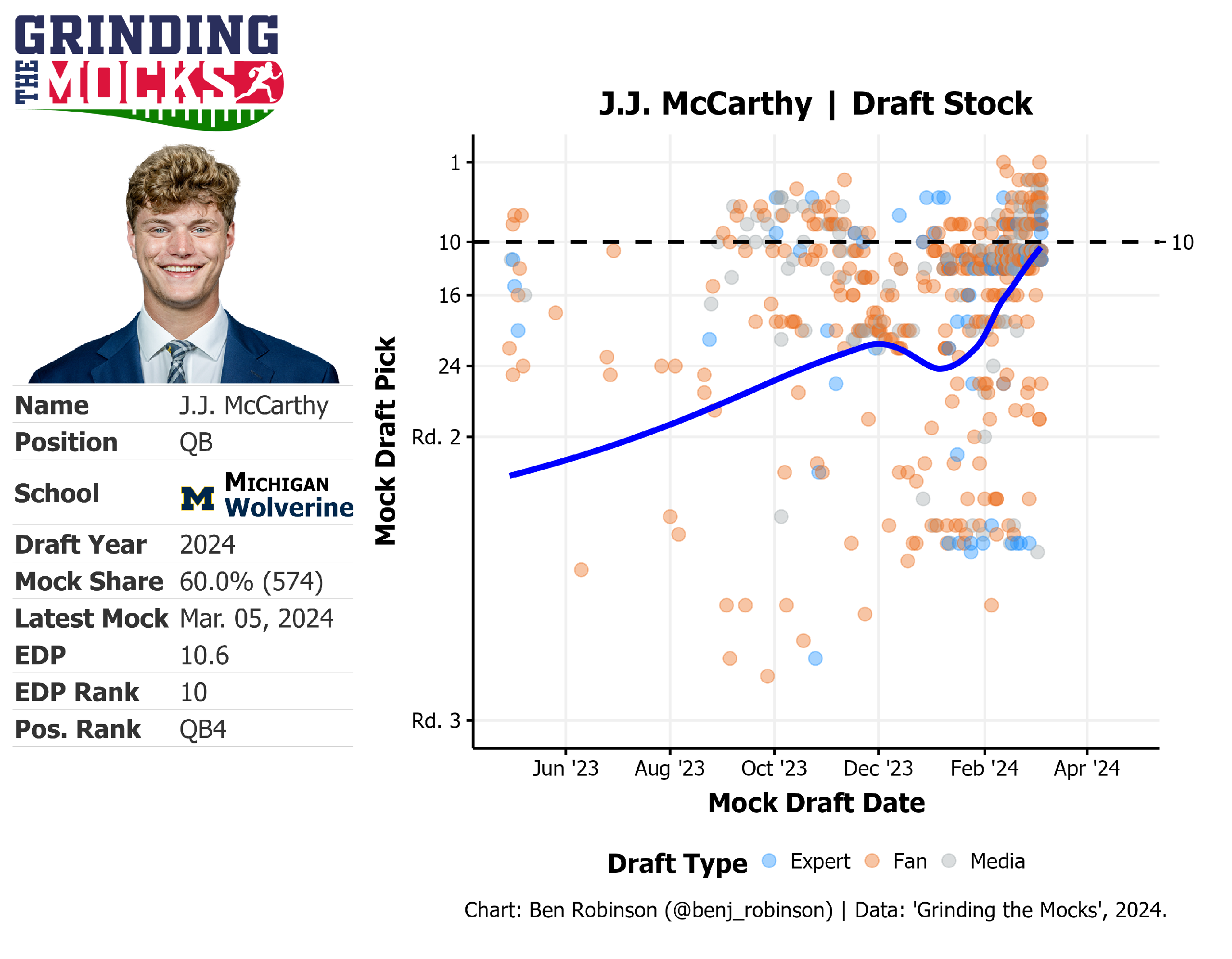 McCarthy's draft stock has been attached to a jetpack, lately, as more and more teams fall in love with his intangibles and clutch factor. There are physical limitations to his game, but as we've seen with Brock Purdy, it doesn't really matter as long as the system fits a QB's strengths (although the Purdy example is a slippery slope, but I digress).