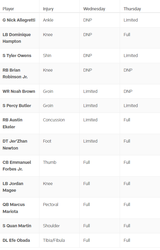 Robinson's availability for Sunday is now in a lot of doubt since it's been two straight days of no practice. Wide receiver Noah Brown, a late offseason acquisition that has been trying to gain his footing with Jayden Daniels and the Commanders offense, was downgraded from a limited participant on Wednesday to a non-participant on Thursday. The veteran wideout is currently dealing with a groin injury and Thursday's designation certainly doesn't bode well for his Week 5 availability, either.