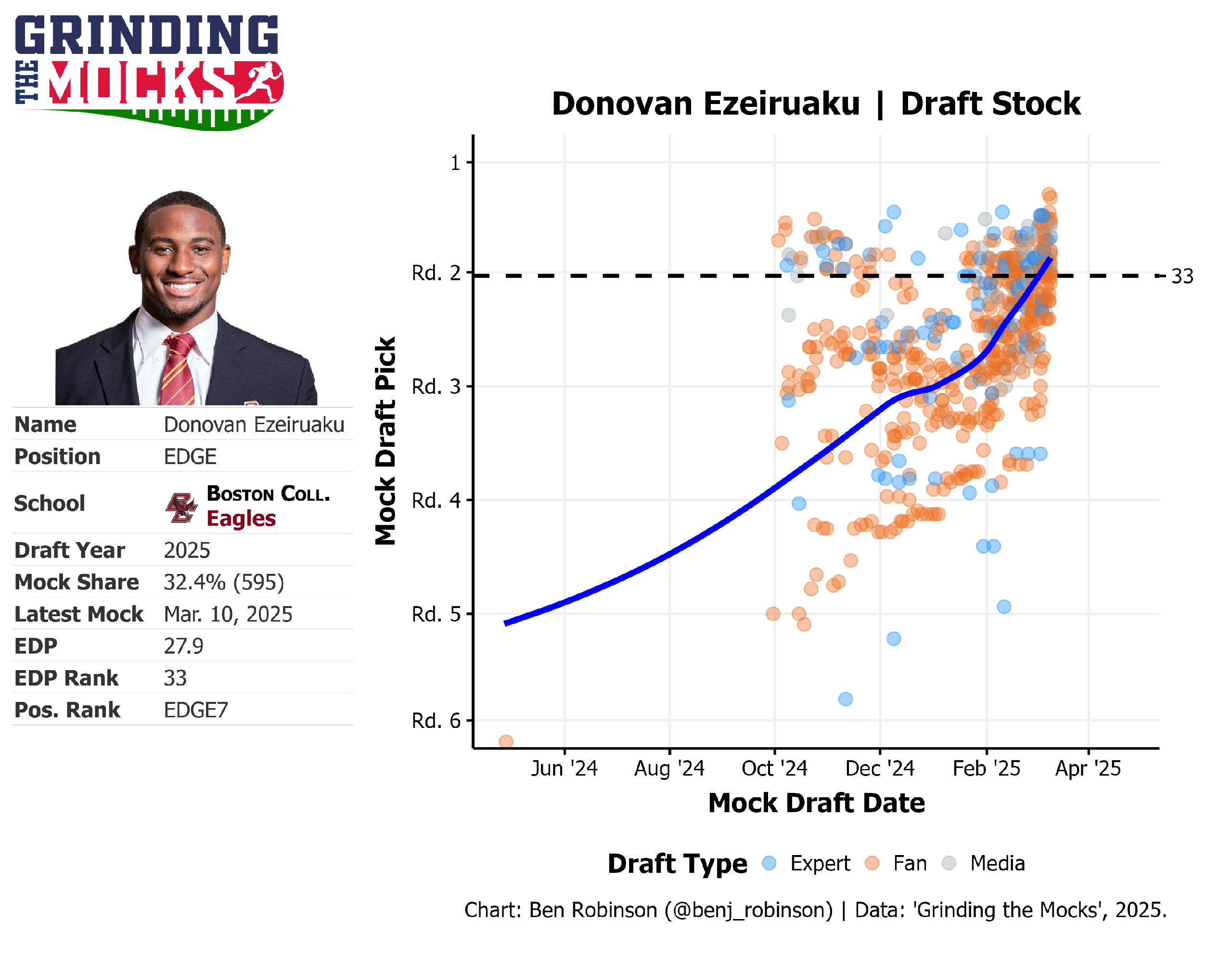 I'm going to go ahead and take advantage of the current likelihood of Ezeiruaku being here at No. 29, because said likelihood is probably going to get smaller and smaller as we approach the draft. Ezeiruaku's stock is skyrocketing after the Combine, but he's still expected to go in the back of the first round/early second round as you can see below: