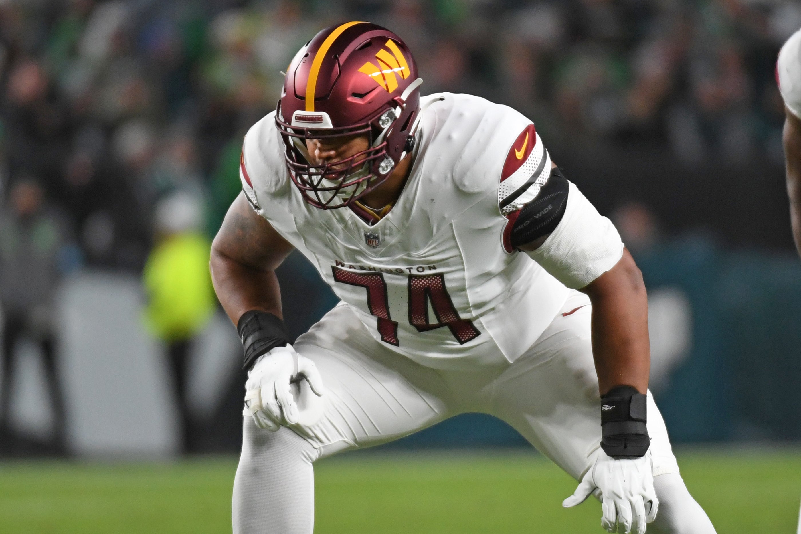 Nov 14, 2024; Philadelphia, Pennsylvania, USA; Washington Commanders offensive tackle Brandon Coleman (74) against the Philadelphia Eagles at Lincoln Financial Field.© Eric Hartline-Imagn Images