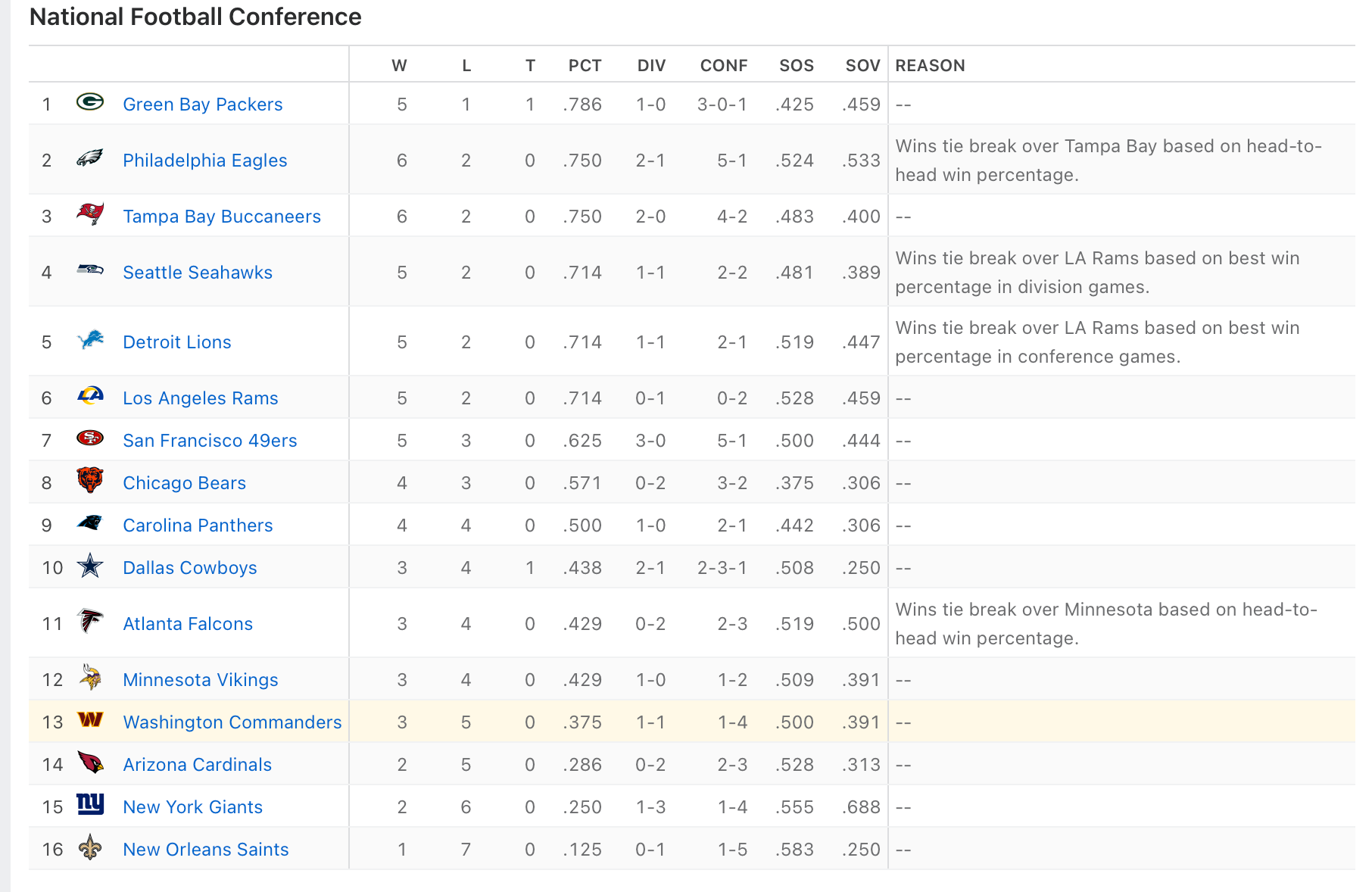 The Commanders have the Seattle Seahawks and Detroit Lions next, and they’re 13th in the NFC, with four NFC losses, the second most in the conference. Two more NFC losses will put the Commanders in a position where they have to sweep the rest of the season to have a chance, and that’s just not realistic with this team.