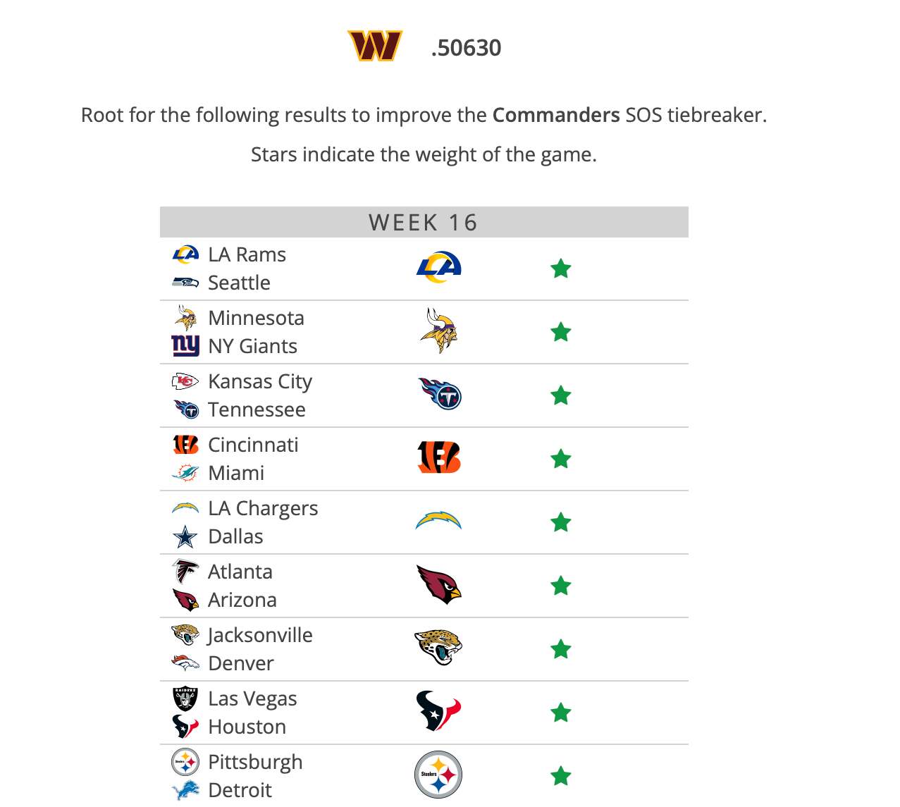 The Seattle Seahawks beat the Commanders weeks ago, which was the lowest point of the season, and they don’t play the Los Angeles Rams this season. The Commanders need the Rams to win so the Seahawks’ record will be worse, which improves Washington’s strength of schedule. The lower the SOS, the better for tiebreakers, and the Commanders currently have a SOS of .506. This will be the game of the week, and honestly, a tough one to call for TNF.