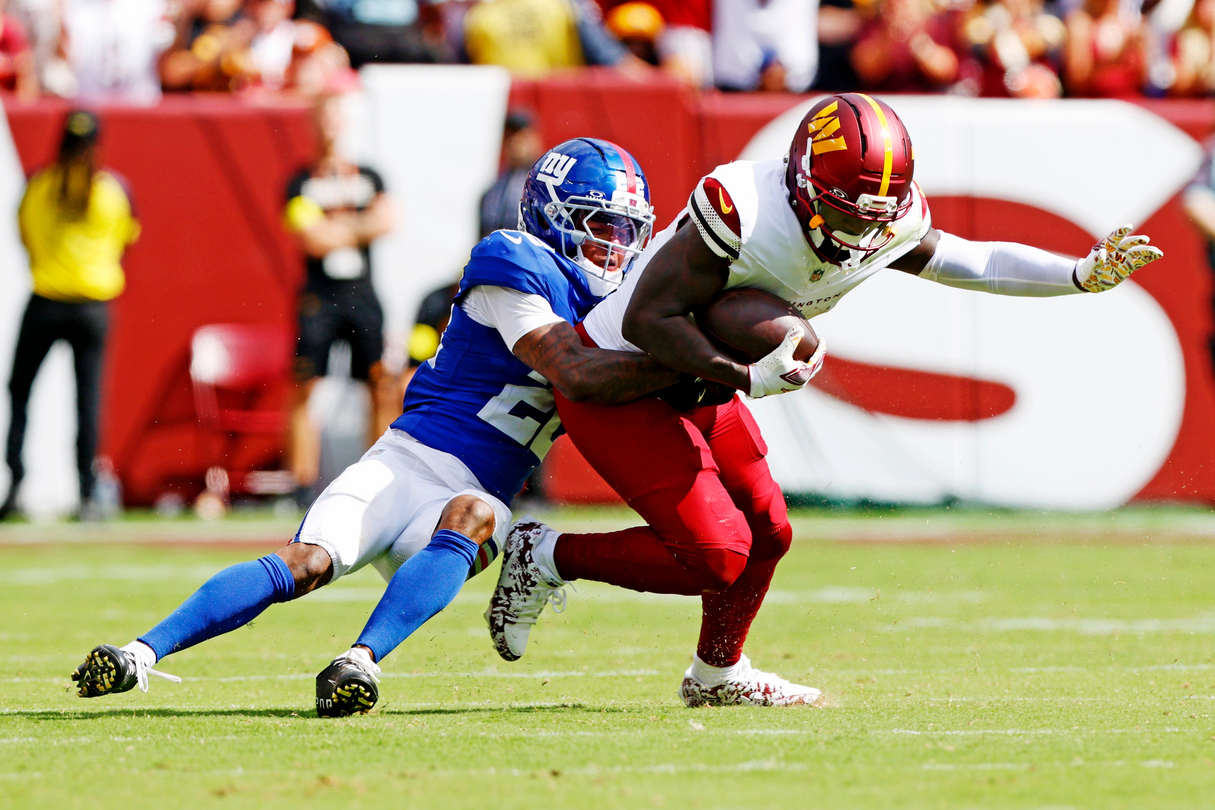 Sep 7, 2025; Landover, Maryland, USA; Washington Commanders wide receiver Deebo Samuel (1) is tackled by New York Giants cornerback Dru Phillips (22) during the fourth quarter at Northwest Stadium. © Peter Casey-Imagn Images