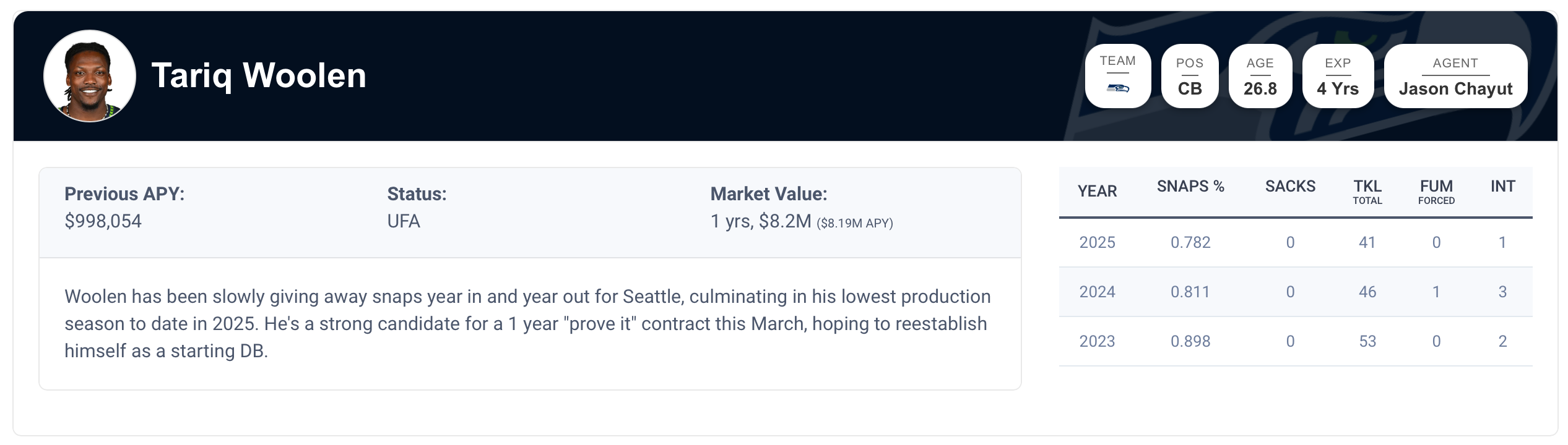 Woolen has had a very up-and-down career in Seattle, and his market projection is difficult to gauge because different teams will have different outlooks on him. Spotrac has him getting a one-year, $8 million prove-it deal, while PFF has him expected to get a three-year, $45 million contract this offseason. Woolen’s first few weeks of the season were as bad as it gets, but then he became a top-10 corner in the league over the last five games. He’s 6-4, 205 pounds, and about to turn 27.