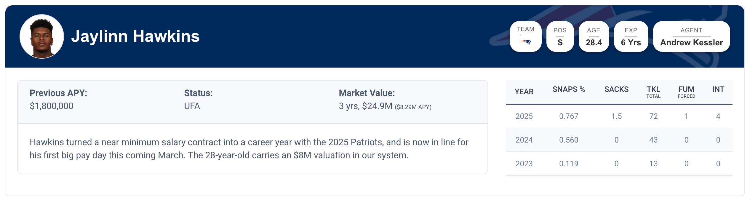He was one of the best safeties in the NFL in 2025 and was well worth the contract he received this offseason. At 28, Hawkins is projected to get a three-year, $25 million contract, which is well within range for the Commanders.