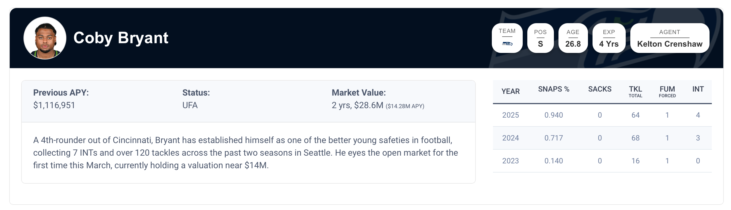Coby Bryant has been an underrated part of the Seahawks’ defense. He thrives in the run game, but also has four interceptions on the season. Bryant is just 26 and continues to improve every year.