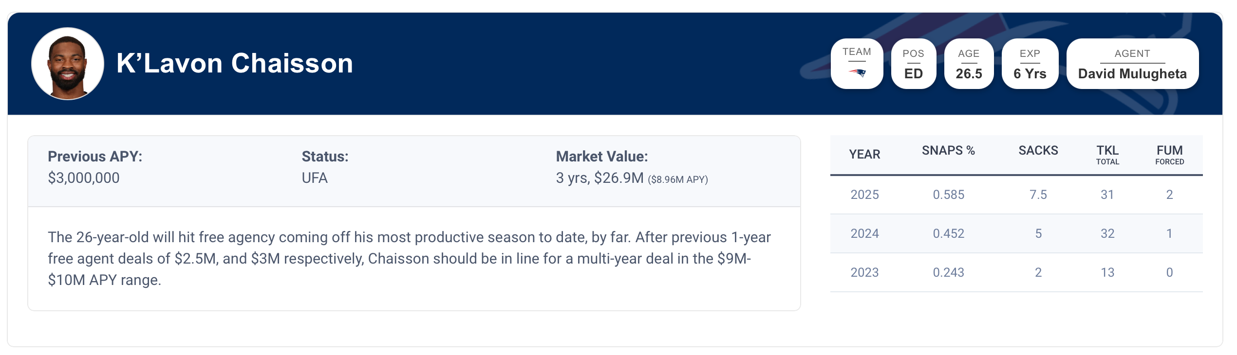 Just like a lot of the Patriots’ underrated free agent signings last season, K’Lavon Chaisson has had the best year of his career in New England and is looking for a payday. Chaisson doesn’t play on every down, but he makes the most of every rep he gets. He has 54 pressures on just 400 pass rush snaps this season, with seven and a half sacks to go with it.