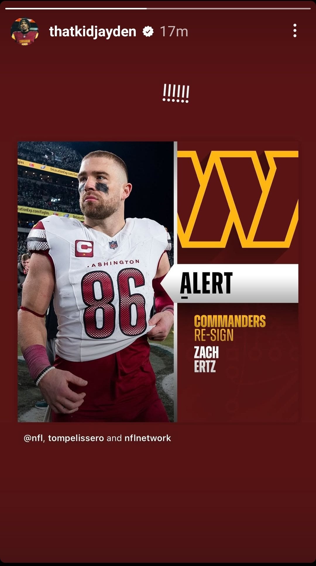 Ertz was a key factor in the Commanders offense last year, as he made several clutch plays and helped Jayden Daniels develop during his historical rookie year. It's a big move for Washington, and Daniels clearly loves it, as he expressed as much on Instagram after the signing was announced: