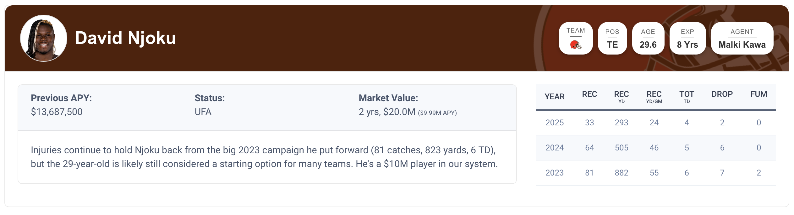 Unfortunately, those injuries carried over to 2025, and rookie tight end Harold Fannin Jr. took over as the starting option. Njoku played 1,021 snaps in 2023, but then only played 590 and 515 snaps over the last two seasons. He suffered a right knee strain in October of 2024, and it persisted in December of 2024, October of 2025, and December of 2025.