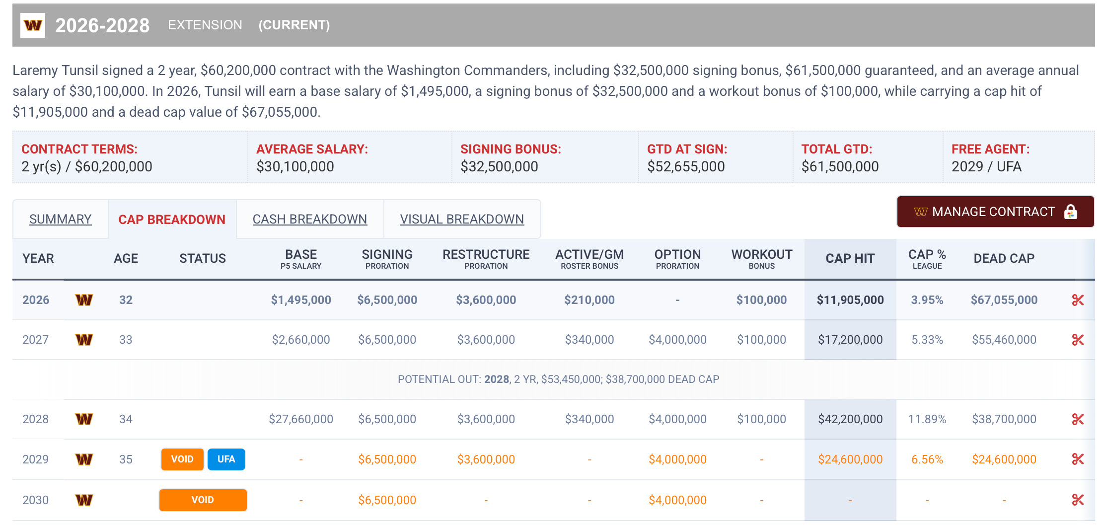 The same goes for Tunsil’s deal. You would think his cap hit is around $30 million per year, right? Not even close. Tunsil carries a 2026 cap hit of just $11.9 million, which goes up to $17.2 million in 2027. There’s an option for an out or an extension in 2028 if both sides want it, which is why his 2028 salary cap hit is so high at $42.2 million.